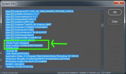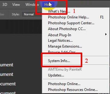 Bước 3: Kiểm tra bản quyền phần mềm Photoshop CC 2015 Full bằng cách vào Menu Help > Sytem info… như hình.