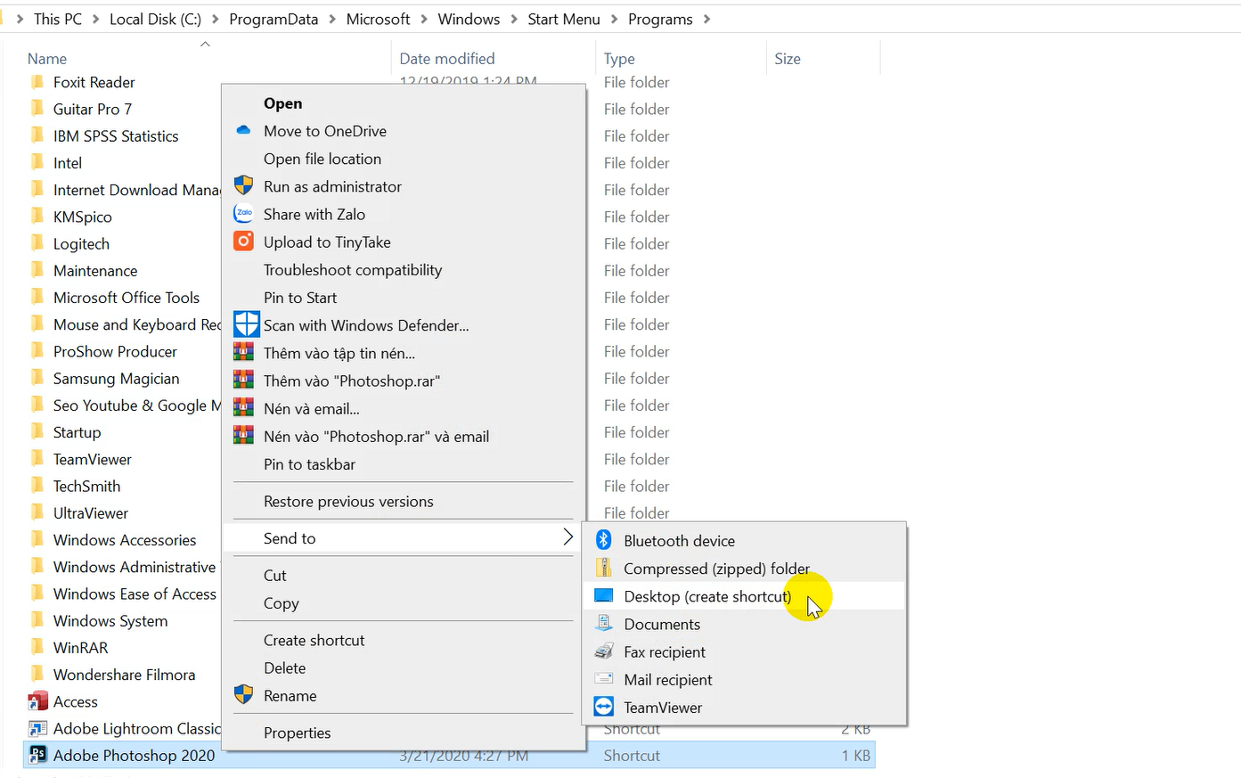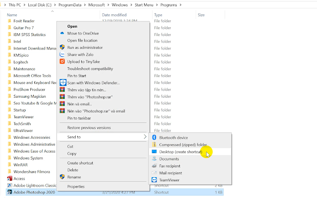 Thực hiện tiếp như trong hình bên dưới để đưa biểu tượng Photoshop 2020 ra màn hình Desktop.