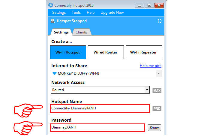 Hotspot Name: Bạn đặt ên Wi-Fi (Lưu ý:Không sử dụng tiếng Việt bạn nhé)
