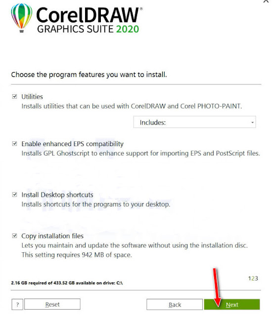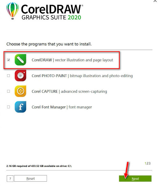 Bạn có thể chọn tất cả hoặc chọn cài đặt chỉ phần mềm CorelDRAW Graphics Suite 2020 thôi. Cái này tùy nhu cầu của bạn nhé. Như bên dưới thì mình chỉ chọn cài đặt CorelDRAW 2020 thôi nhé.