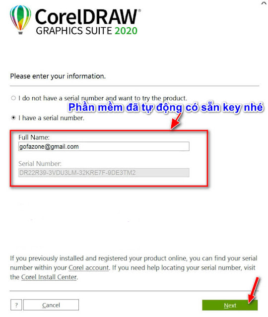 Như các bạn đã thấy, phần mềm đã tích hợp sẵn key. Ở bước này, bạn không cần làm gì cả, chỉ cần bấm Next thôi.