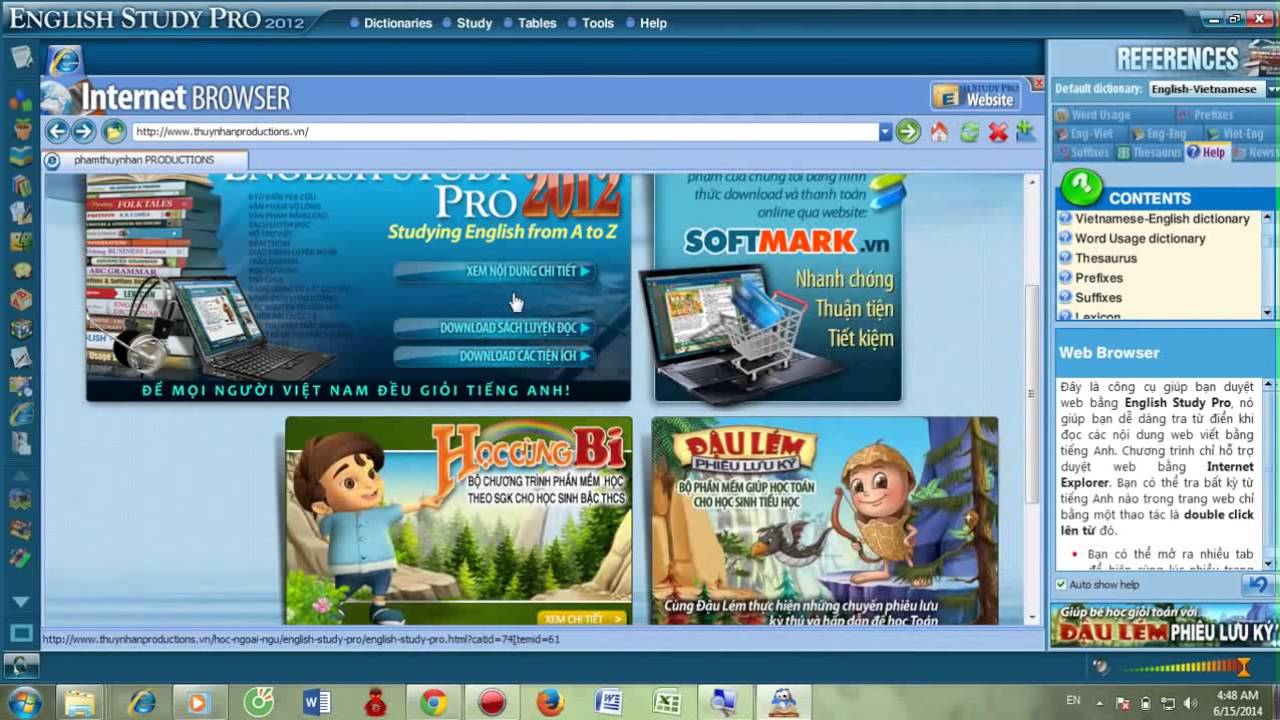 “English Study Pro 2012 cung cấp cho bạn nhiều từ điển, bài học từ nền tảng đến nâng cao. Những công cụ trong English Study Pro như công cụ hỗ trợ viết, thư viện sách để các bạn luyện đọc, luyện nghe, đối thoại, đàm thoại, các bài kiểm tra và cả trò chơi tiếng Anh sẽ cho bạn những thời gian thoải mái, thư giãn trong việc học tiếng Anh”.