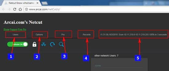 1 – Users: Có những công cụ như Defender On, Lock, Cut Off, Reload, Search và danh sách các kết nối tới mạng.